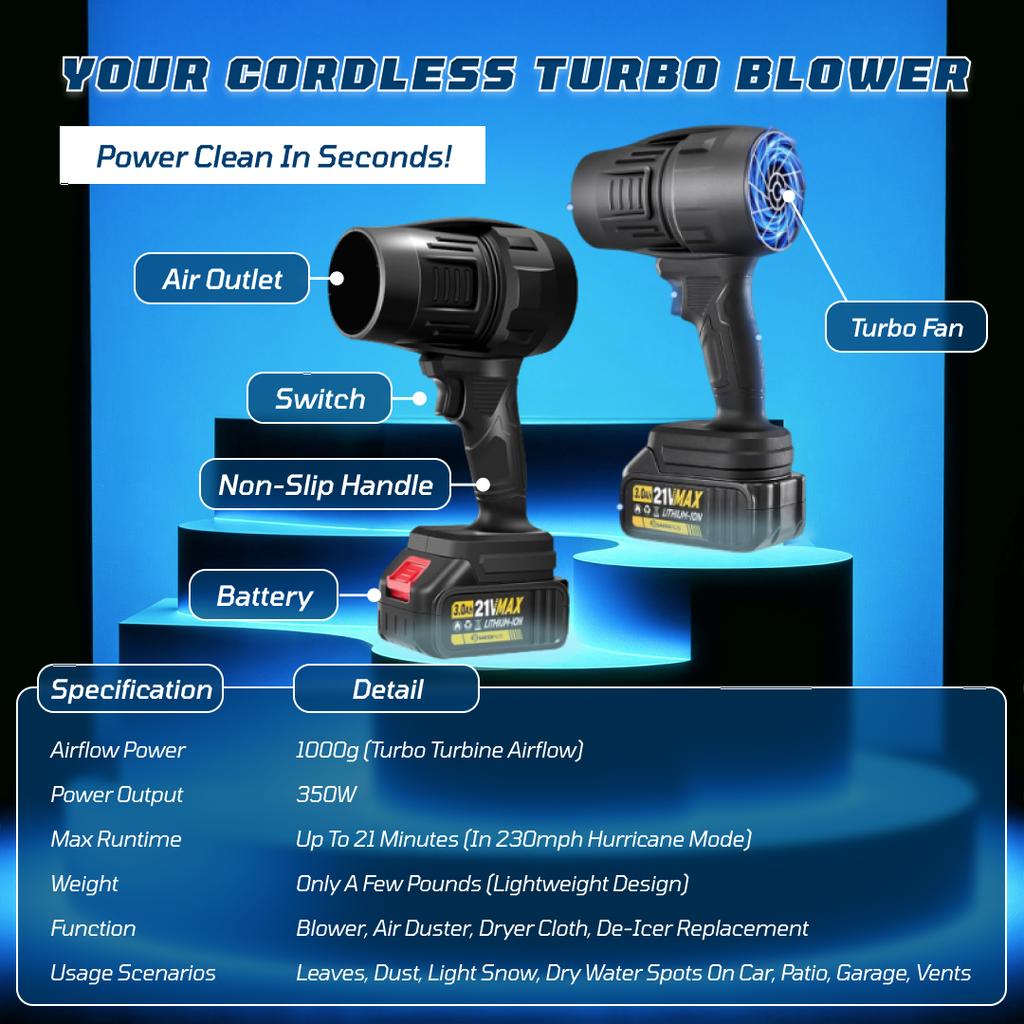 Imagine cutting your cleanup time in half with a supercharged blower that fits comfortably in one hand. The Turbo Leaf Blowerβs turbine technology deliversΒ an insane 1000g of airflow, obliterating leaves, dust, and even stubborn snow from your yard, garage, or car.Β