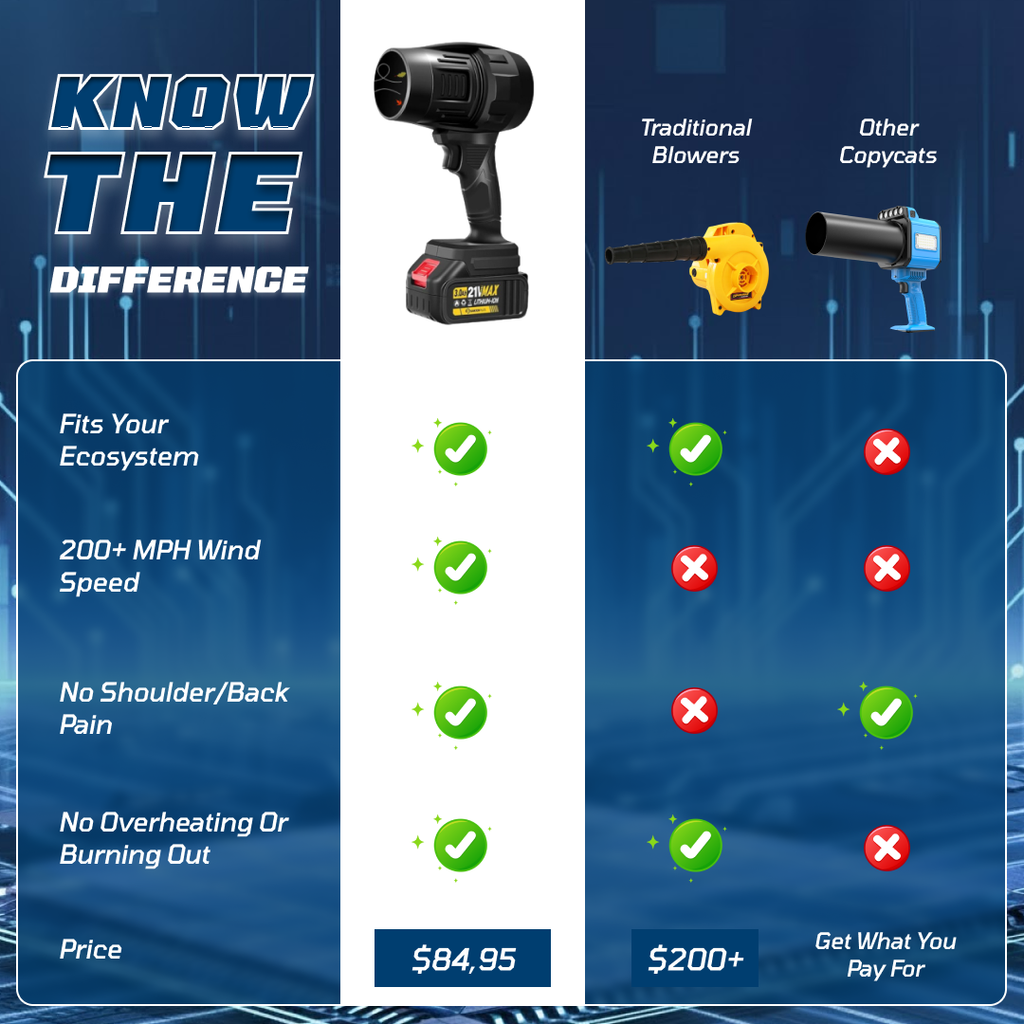Β Our Premium Cordless Turbo Blower is engineered to outperform the competition, combining next-generation technology with an unbeatable price. We challenge the standard set by outdated, heavy equipment and unreliable copycats.